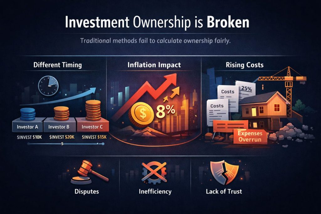 In collaborative investments, traditional systems fail to calculate ownership fairly because they ignore the timing of investments, inflation, and dynamic project costs. This often leads to disputes, inefficiency, and lack of trust.