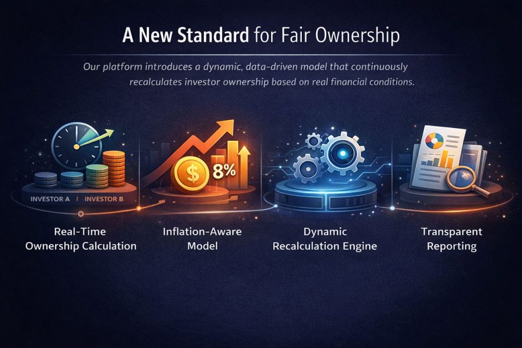 Our platform introduces a dynamic, data-driven model that continuously recalculates investor ownership based on real financial conditions.