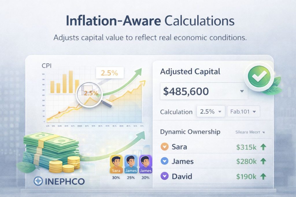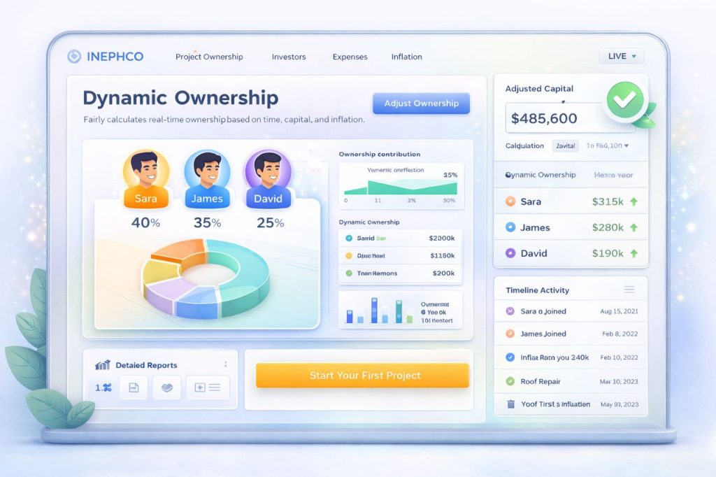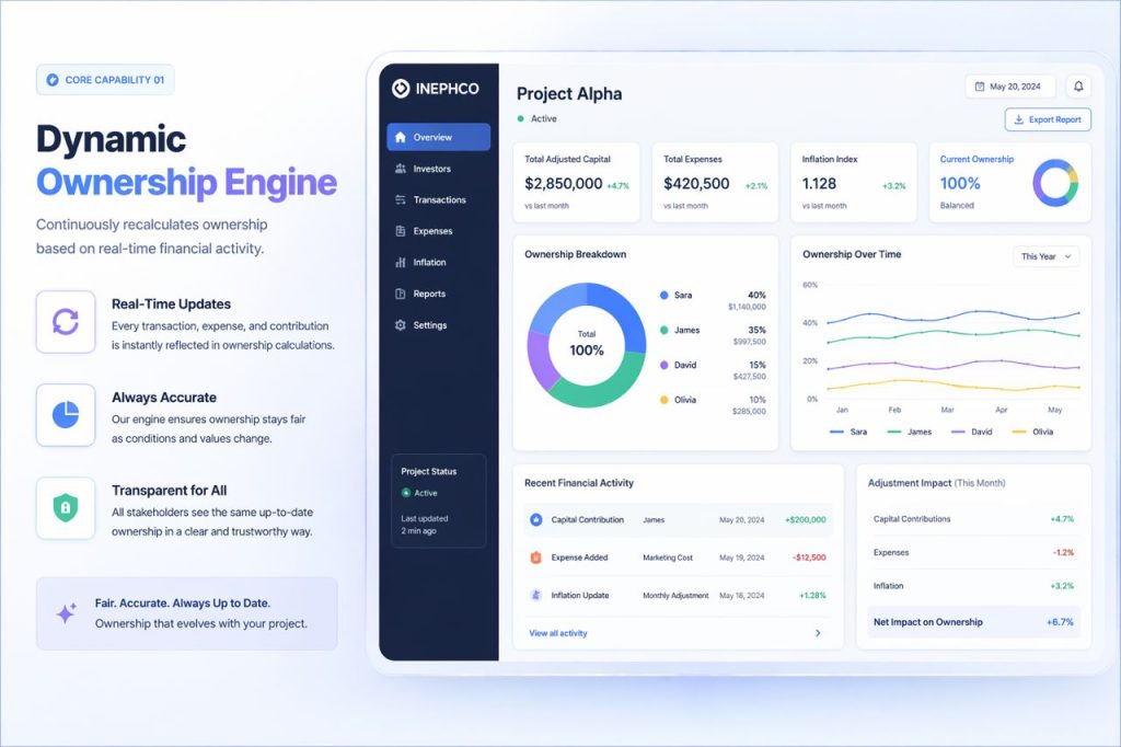 INEPHCO is a dynamic platform that calculates fair ownership based on time, capital, and real economic conditions.