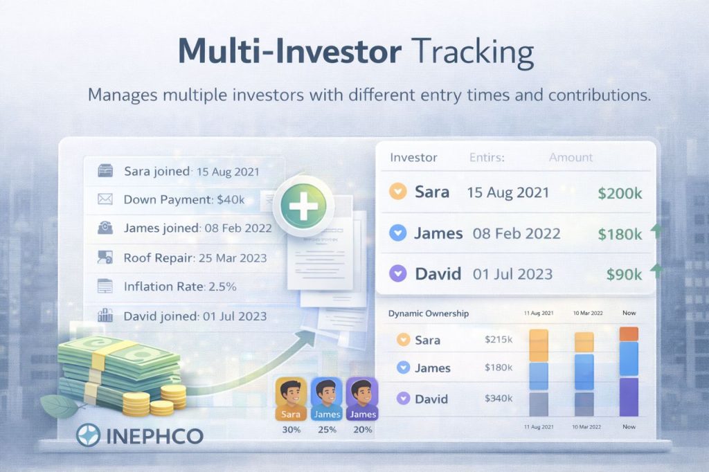 Manages multiple investors with different entry times and contributions.